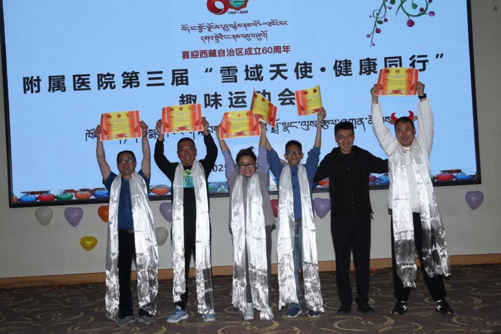 多杰仁青宣布开幕,至此附属医院以“雪域天使·健康同行”为主题的趣味运动会正式拉开序幕,本次活动设置文艺演出与趣味游戏两大环节。文艺演出中,个人独唱、人偶队舞蹈、锅庄舞蹈节目轮番上演,展现职工风采,传递对自治区成立60周年的祝福。趣味游戏包含抢凳子、蒙眼原地踏步等六个项目,现场氛围热烈,职工踊跃参与。活动最后,医院领导为在游戏中表现优异的个人和科室颁发奖状,肯定其积极表现。