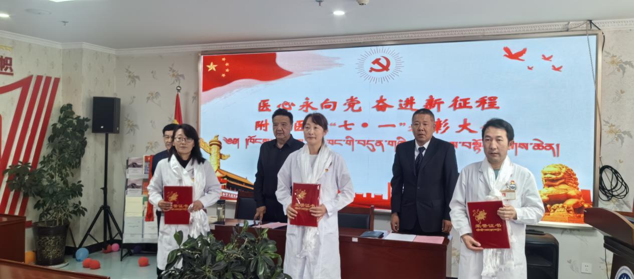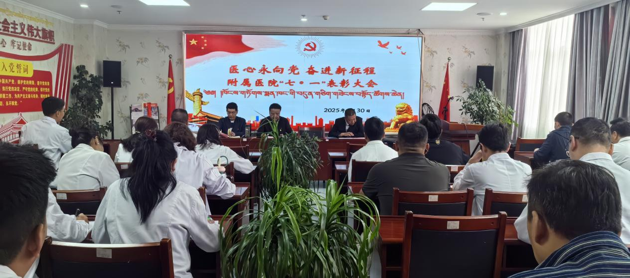 6月30日下午,附属医院在四楼会议室举行“医心永向党 奋进新征程”庆祝中国共产党成立104周年暨“七一”表彰大会。党总支书记达娃平措、副院长白玛罗布及全体党员参加大会,副院长郭洪宇主持会议。
