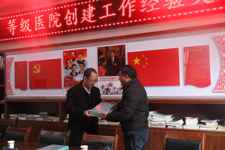 在座谈会上王积瑞书记按照我校尼玛次仁教授嘱托向林芝市藏医院赠送了尼玛次仁教授所编著的《藏医药四部医典疑难类注释》,共10套。
